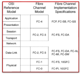یک پروتکل استاندارد برای ارسال SCSI Commands روی شبکههای ذخیرهسازی با Protocol Stack مستقل خود و برای برقراری ارتباطات میباشد. شکل زیر مدل Fiber Channel را در مقایسه با OSI نشان میدهد.