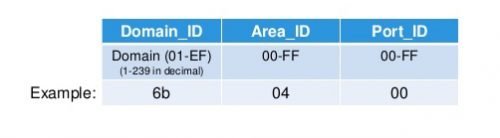 برای اینکه هر دستگاه بتواند در fabric ارتباط برقرار کند و مسیریابی انجام شود،نیاز به یک شناسه یکتا دارد که این شناسه توسط سویچ ای که به آن متصل است اختصاص داده میشود و در جدولی این اطلاعات ثبت میشود.این آدرس یکتا 24 بیت دارد که از سه بخش (Domain| Area |Port (Dynamic تشکیل شده است.