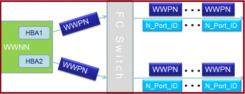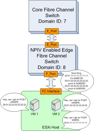 در Fiber Channel سنتی هر سویچ به ازای هر N-port که به آن متصل است یک FCID تخصیص میدهد.ولی ما در محیط های مجازی شاهد این هستیم که یک Esxi با یک HBA میتواند چندین VHBA داشته باشد.ویزگی به نام (N-Port Virtualization (NPV و (N-Port Identifier Virtualization (NPIV برای حل همچین مشکل مطرح شد.