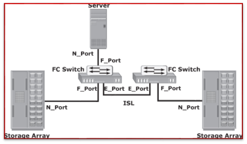 - N Port: سرورها و ذخیرهسازها در شبکه FC به عنوان یک Node پورت شناخته میشوند که به Switch یا Directors متصل میشوند.